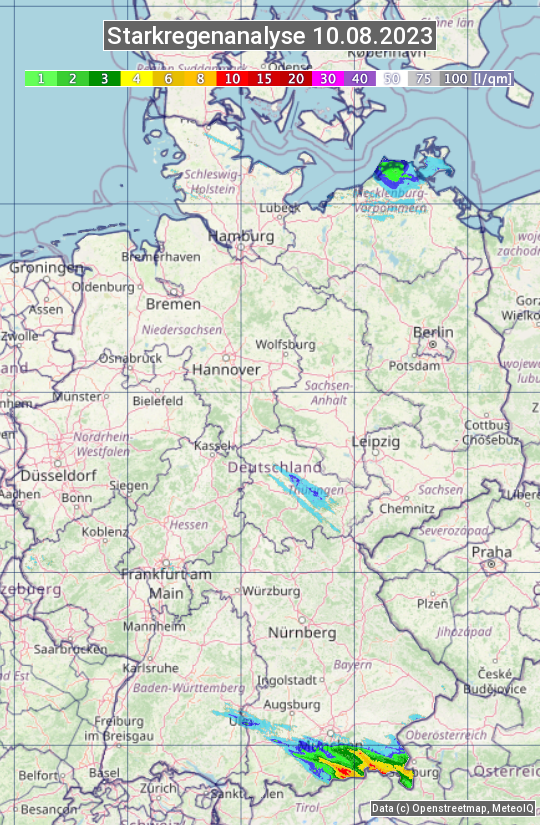 Die Starkregenanalyse zeigt die 24h-Niederschlagssumme am 10.08.2023. Sie basiert auf Radardaten vom Deutschen Wetterdienst in Kombination mit Wetterstationsbeobachtungen.