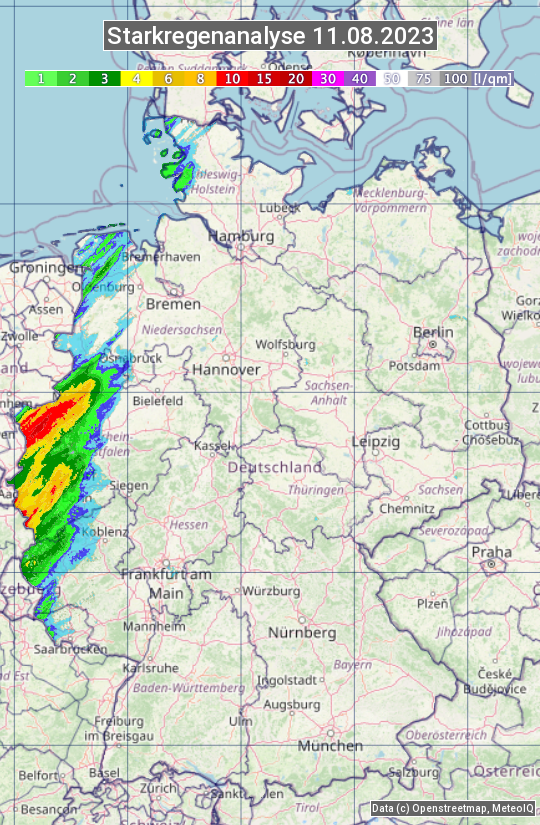 Die Starkregenanalyse zeigt die 24h-Niederschlagssumme am 11.08.2023. Sie basiert auf Radardaten vom Deutschen Wetterdienst in Kombination mit Wetterstationsbeobachtungen.