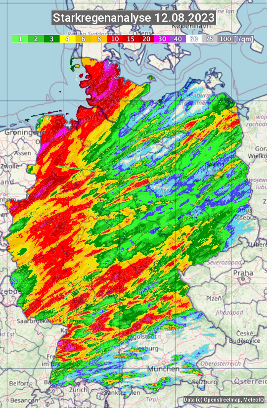 Die Starkregenanalyse zeigt die 24h-Niederschlagssumme am 12.08.2023. Sie basiert auf Radardaten vom Deutschen Wetterdienst in Kombination mit Wetterstationsbeobachtungen.