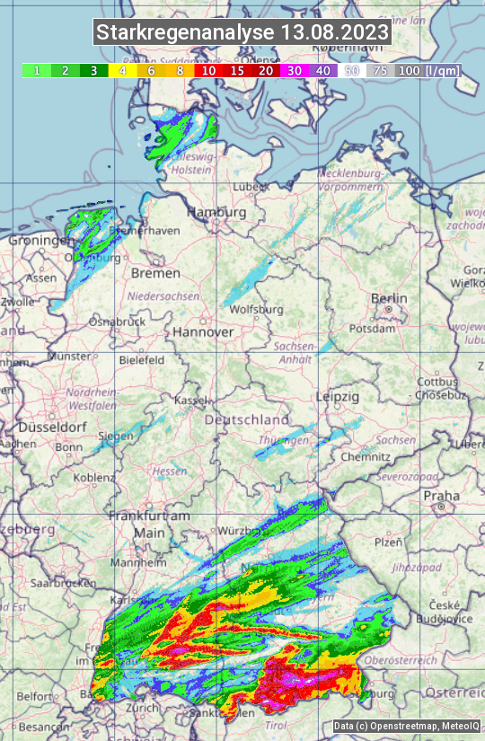 Die Starkregenanalyse zeigt die 24h-Niederschlagssumme am 13.08.2023. Sie basiert auf Radardaten vom Deutschen Wetterdienst in Kombination mit Wetterstationsbeobachtungen.