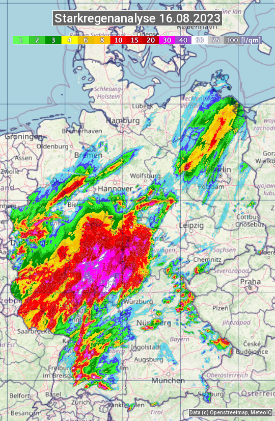 Die Starkregenanalyse zeigt die 24h-Niederschlagssumme am 16.08.2023. Sie basiert auf Radardaten vom Deutschen Wetterdienst in Kombination mit Wetterstationsbeobachtungen.