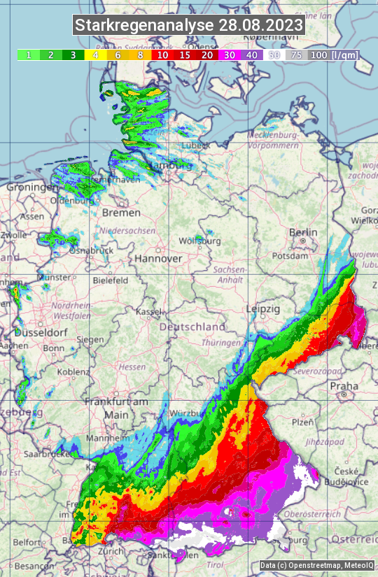Die Starkregenanalyse zeigt die 24h-Niederschlagssumme am 28.08.2023. Sie basiert auf Radardaten vom Deutschen Wetterdienst in Kombination mit Wetterstationsbeobachtungen.