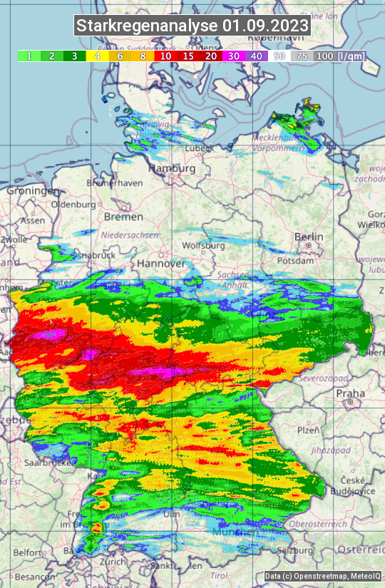 Die Starkregenanalyse zeigt die 24h-Niederschlagssumme am 01.09.2023. Sie basiert auf Radardaten vom Deutschen Wetterdienst in Kombination mit Wetterstationsbeobachtungen.