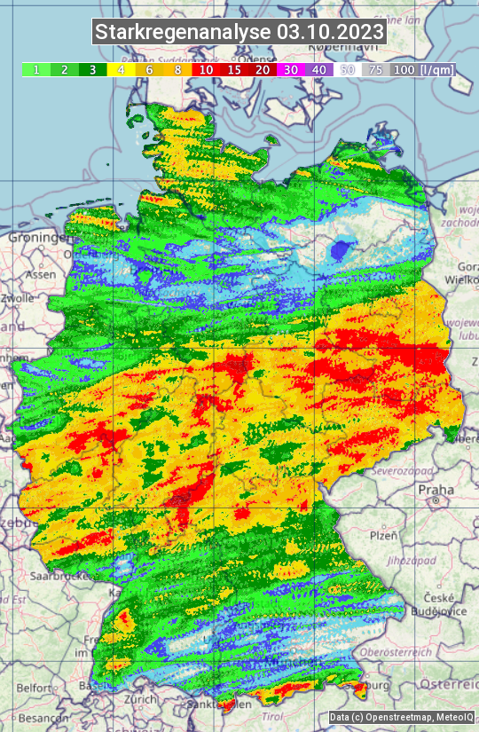 Die Starkregenanalyse zeigt die 24h-Niederschlagssumme am 03.10.2023. Sie basiert auf Radardaten vom Deutschen Wetterdienst in Kombination mit Wetterstationsbeobachtungen.