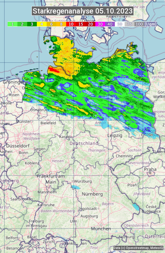 Die Starkregenanalyse zeigt die 24h-Niederschlagssumme am 05.10.2023. Sie basiert auf Radardaten vom Deutschen Wetterdienst in Kombination mit Wetterstationsbeobachtungen.