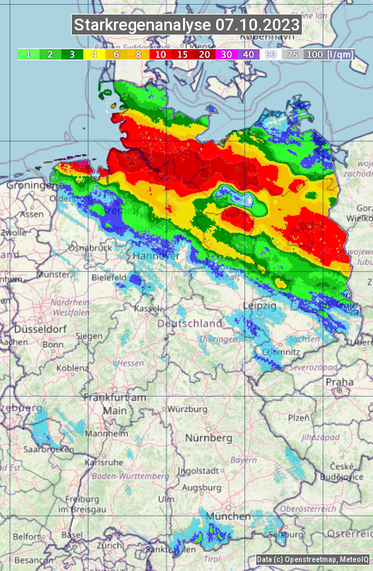 Die Starkregenanalyse zeigt die 24h-Niederschlagssumme am 07.10.2023. Sie basiert auf Radardaten vom Deutschen Wetterdienst in Kombination mit Wetterstationsbeobachtungen.