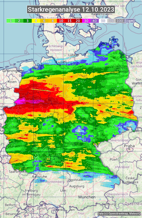 Die Starkregenanalyse zeigt die 24h-Niederschlagssumme am 12.10.2023. Sie basiert auf Radardaten vom Deutschen Wetterdienst in Kombination mit Wetterstationsbeobachtungen.