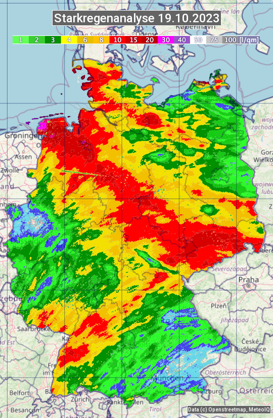 Die Starkregenanalyse zeigt die 24h-Niederschlagssumme am 19.10.2023. Sie basiert auf Radardaten vom Deutschen Wetterdienst in Kombination mit Wetterstationsbeobachtungen.