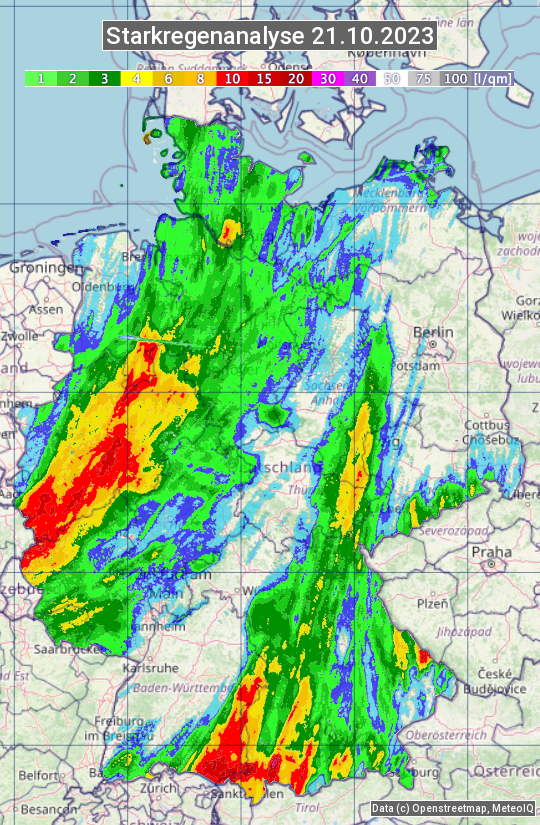 Die Starkregenanalyse zeigt die 24h-Niederschlagssumme am 21.10.2023. Sie basiert auf Radardaten vom Deutschen Wetterdienst in Kombination mit Wetterstationsbeobachtungen.