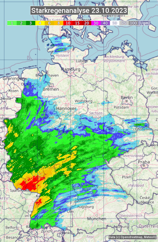 Die Starkregenanalyse zeigt die 24h-Niederschlagssumme am 23.10.2023. Sie basiert auf Radardaten vom Deutschen Wetterdienst in Kombination mit Wetterstationsbeobachtungen.