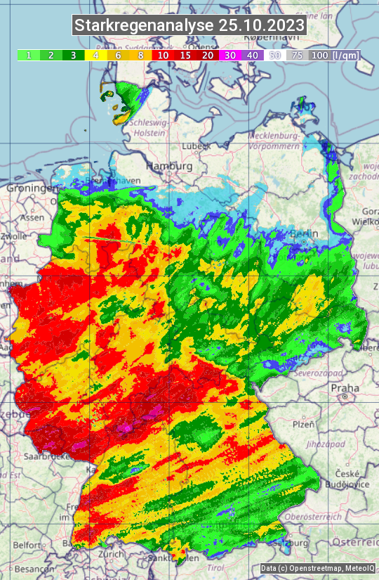 Die Starkregenanalyse zeigt die 24h-Niederschlagssumme am 25.10.2023. Sie basiert auf Radardaten vom Deutschen Wetterdienst in Kombination mit Wetterstationsbeobachtungen.