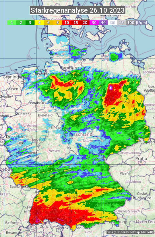 Die Starkregenanalyse zeigt die 24h-Niederschlagssumme am 26.10.2023. Sie basiert auf Radardaten vom Deutschen Wetterdienst in Kombination mit Wetterstationsbeobachtungen.
