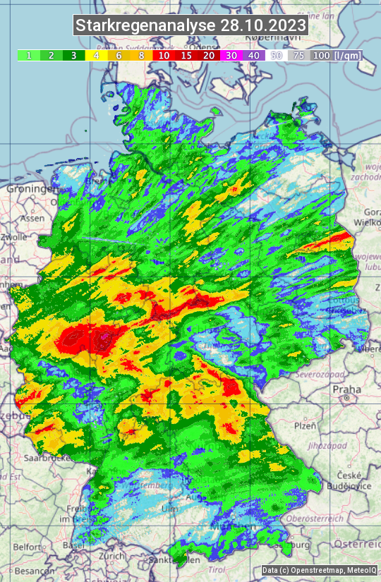 Die Starkregenanalyse zeigt die 24h-Niederschlagssumme am 28.10.2023. Sie basiert auf Radardaten vom Deutschen Wetterdienst in Kombination mit Wetterstationsbeobachtungen.