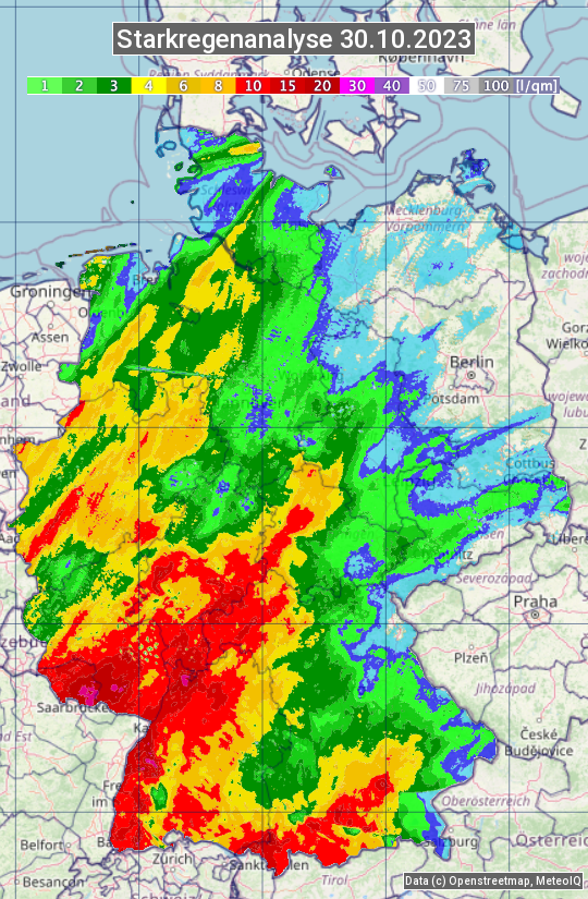 Die Starkregenanalyse zeigt die 24h-Niederschlagssumme am 30.10.2023. Sie basiert auf Radardaten vom Deutschen Wetterdienst in Kombination mit Wetterstationsbeobachtungen.