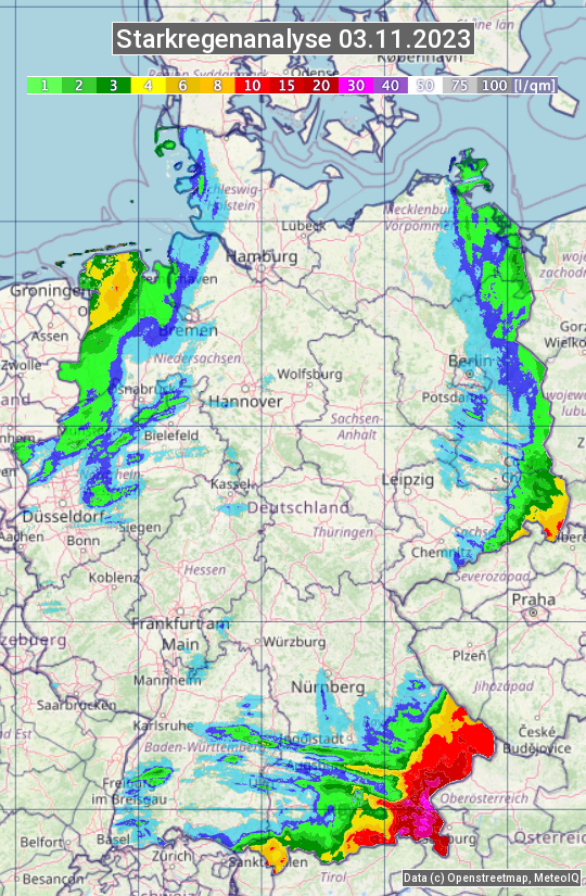 Die Starkregenanalyse zeigt die 24h-Niederschlagssumme am 03.11.2023. Sie basiert auf Radardaten vom Deutschen Wetterdienst in Kombination mit Wetterstationsbeobachtungen.