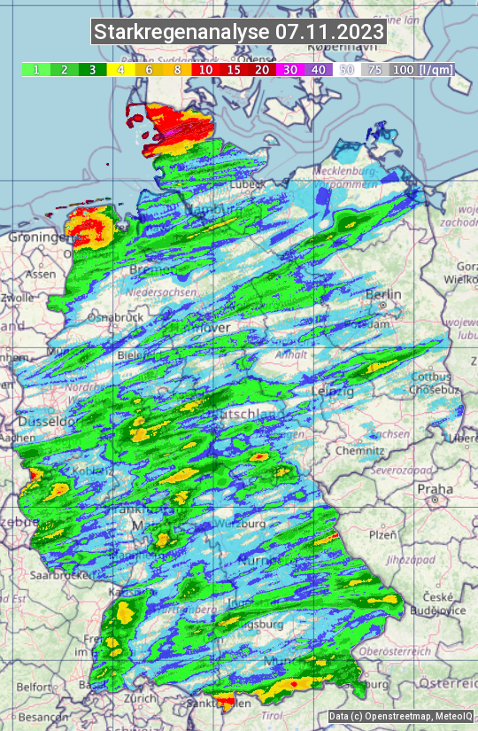 Die Starkregenanalyse zeigt die 24h-Niederschlagssumme am 07.11.2023. Sie basiert auf Radardaten vom Deutschen Wetterdienst in Kombination mit Wetterstationsbeobachtungen.