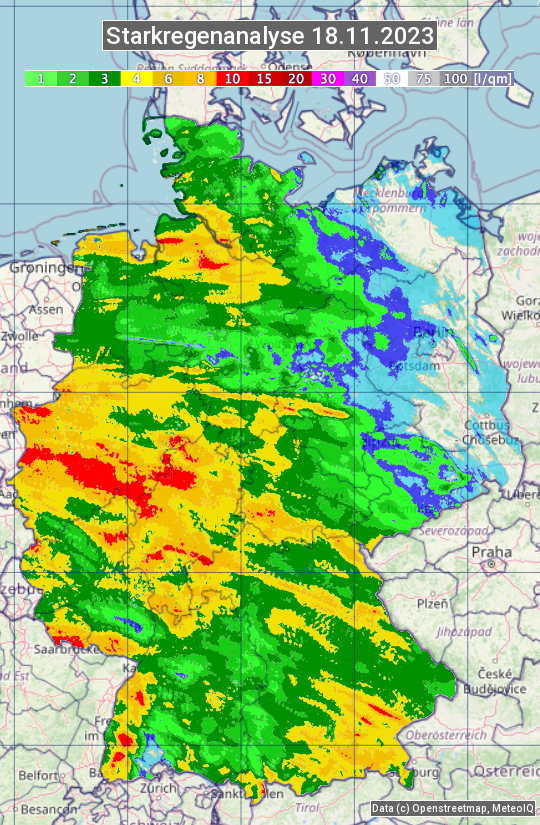 Die Starkregenanalyse zeigt die 24h-Niederschlagssumme am 18.11.2023. Sie basiert auf Radardaten vom Deutschen Wetterdienst in Kombination mit Wetterstationsbeobachtungen.