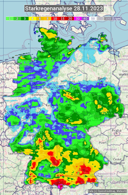 Die Starkregenanalyse zeigt die 24h-Niederschlagssumme am 28.11.2023. Sie basiert auf Radardaten vom Deutschen Wetterdienst in Kombination mit Wetterstationsbeobachtungen.