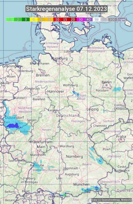 Die Starkregenanalyse zeigt die 24h-Niederschlagssumme am 07.12.2023. Sie basiert auf Radardaten vom Deutschen Wetterdienst in Kombination mit Wetterstationsbeobachtungen.