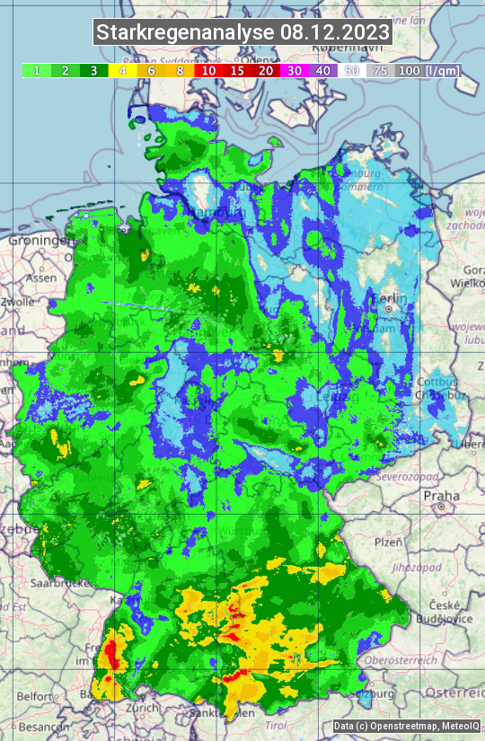 Die Starkregenanalyse zeigt die 24h-Niederschlagssumme am 08.12.2023. Sie basiert auf Radardaten vom Deutschen Wetterdienst in Kombination mit Wetterstationsbeobachtungen.