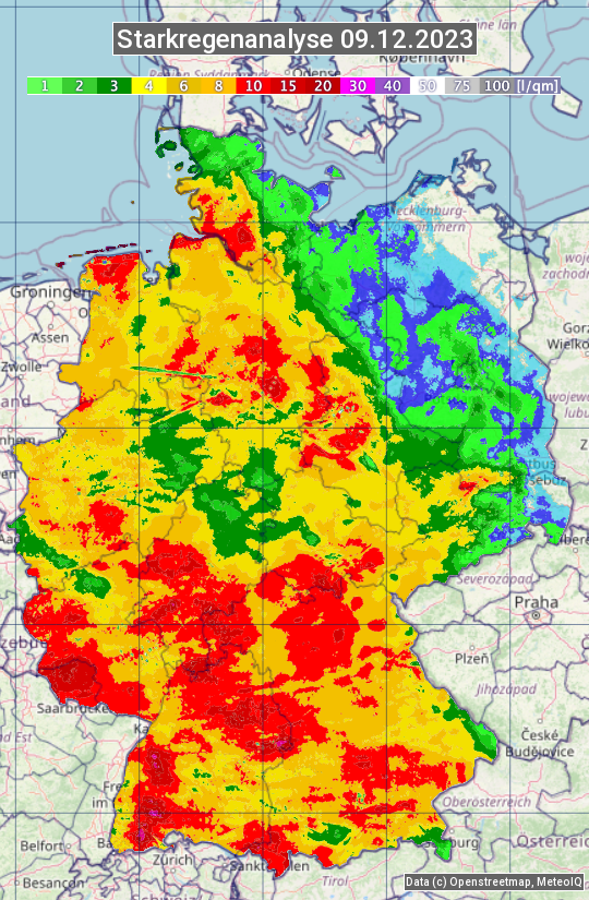 Die Starkregenanalyse zeigt die 24h-Niederschlagssumme am 09.12.2023. Sie basiert auf Radardaten vom Deutschen Wetterdienst in Kombination mit Wetterstationsbeobachtungen.