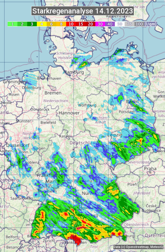 Die Starkregenanalyse zeigt die 24h-Niederschlagssumme am 14.12.2023. Sie basiert auf Radardaten vom Deutschen Wetterdienst in Kombination mit Wetterstationsbeobachtungen.