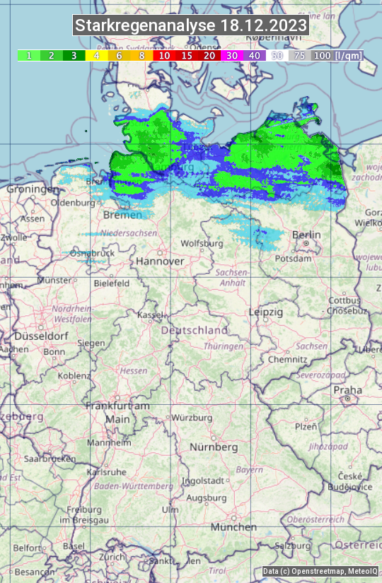 Die Starkregenanalyse zeigt die 24h-Niederschlagssumme am 18.12.2023. Sie basiert auf Radardaten vom Deutschen Wetterdienst in Kombination mit Wetterstationsbeobachtungen.