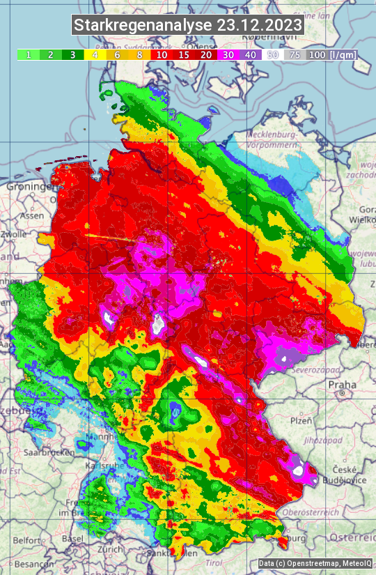 Die Starkregenanalyse zeigt die 24h-Niederschlagssumme am 23.12.2023. Sie basiert auf Radardaten vom Deutschen Wetterdienst in Kombination mit Wetterstationsbeobachtungen.