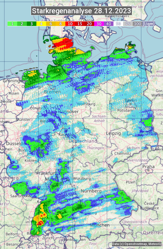 Die Starkregenanalyse zeigt die 24h-Niederschlagssumme am 28.12.2023. Sie basiert auf Radardaten vom Deutschen Wetterdienst in Kombination mit Wetterstationsbeobachtungen.
