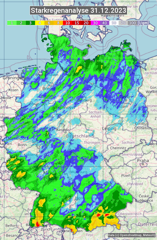 Die Starkregenanalyse zeigt die 24h-Niederschlagssumme am 31.12.2023. Sie basiert auf Radardaten vom Deutschen Wetterdienst in Kombination mit Wetterstationsbeobachtungen.
