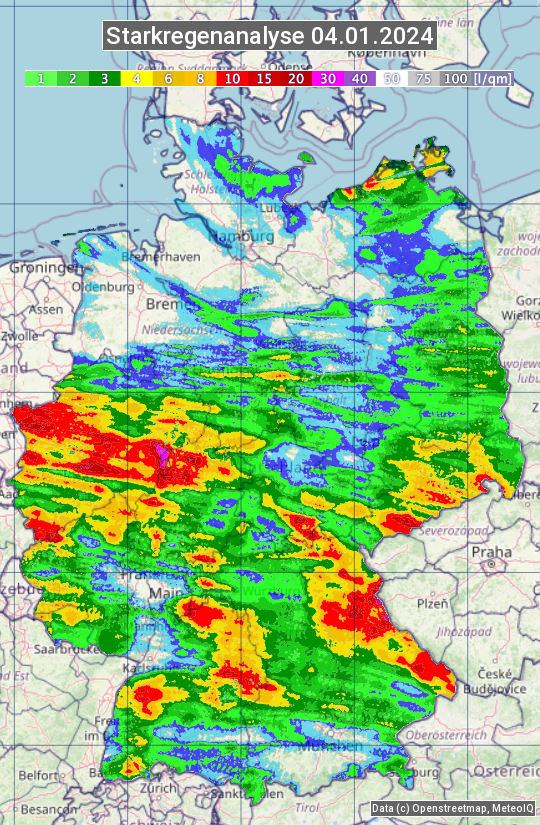 Die Starkregenanalyse zeigt die 24h-Niederschlagssumme am 04.01.2024. Sie basiert auf Radardaten vom Deutschen Wetterdienst in Kombination mit Wetterstationsbeobachtungen.