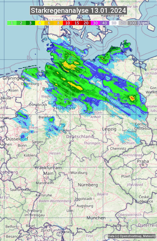 Die Starkregenanalyse zeigt die 24h-Niederschlagssumme am 13.01.2024. Sie basiert auf Radardaten vom Deutschen Wetterdienst in Kombination mit Wetterstationsbeobachtungen.