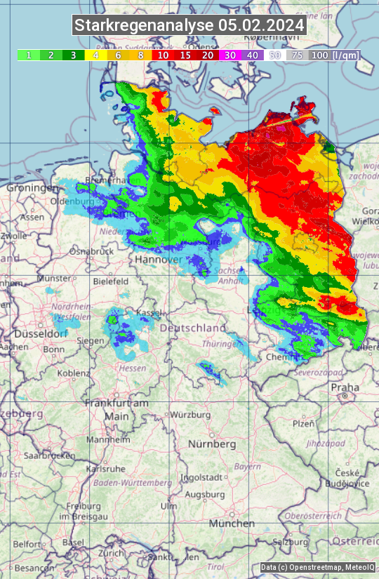 Die Starkregenanalyse zeigt die 24h-Niederschlagssumme am 05.02.2024. Sie basiert auf Radardaten vom Deutschen Wetterdienst in Kombination mit Wetterstationsbeobachtungen.