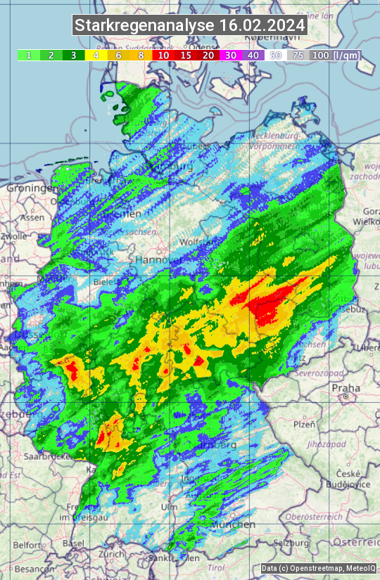 Die Starkregenanalyse zeigt die 24h-Niederschlagssumme am 16.02.2024. Sie basiert auf Radardaten vom Deutschen Wetterdienst in Kombination mit Wetterstationsbeobachtungen.