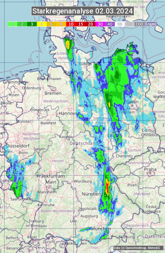 Die Starkregenanalyse zeigt die 24h-Niederschlagssumme am 02.03.2024. Sie basiert auf Radardaten vom Deutschen Wetterdienst in Kombination mit Wetterstationsbeobachtungen.