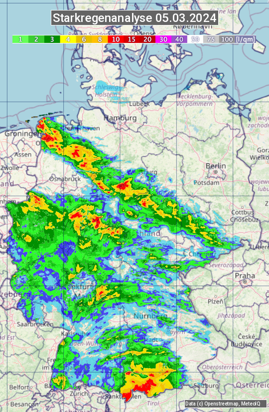 Die Starkregenanalyse zeigt die 24h-Niederschlagssumme am 05.03.2024. Sie basiert auf Radardaten vom Deutschen Wetterdienst in Kombination mit Wetterstationsbeobachtungen.