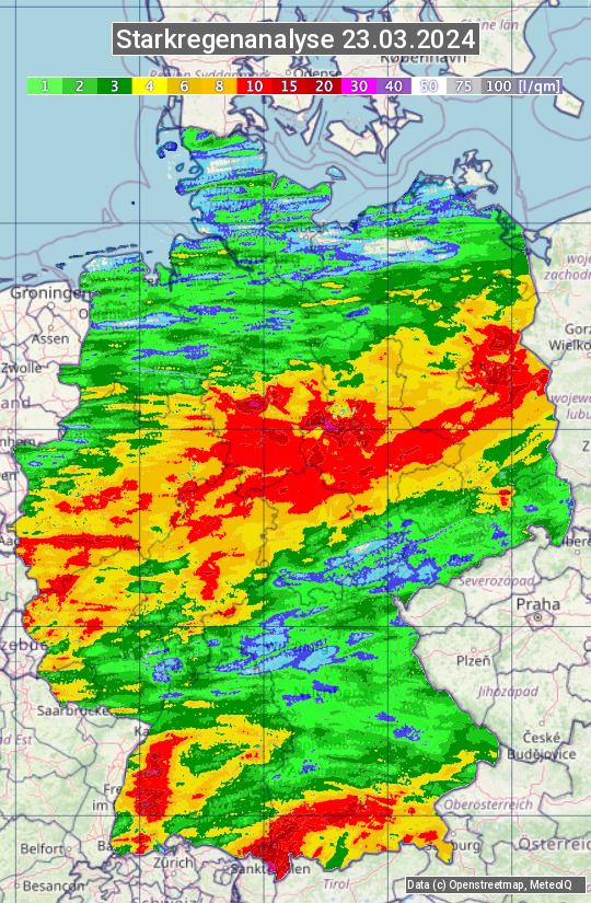 Die Starkregenanalyse zeigt die 24h-Niederschlagssumme am 23.03.2024. Sie basiert auf Radardaten vom Deutschen Wetterdienst in Kombination mit Wetterstationsbeobachtungen.