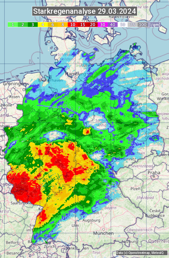 Die Starkregenanalyse zeigt die 24h-Niederschlagssumme am 29.03.2024. Sie basiert auf Radardaten vom Deutschen Wetterdienst in Kombination mit Wetterstationsbeobachtungen.