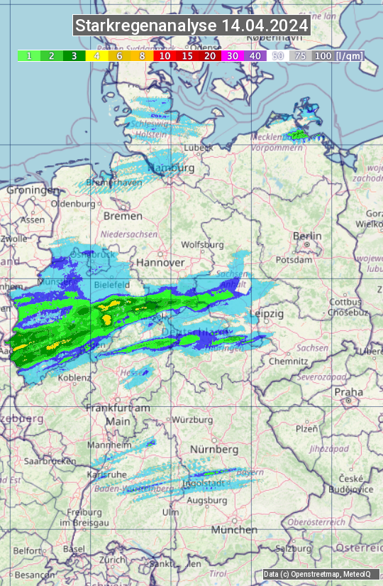 Die Starkregenanalyse zeigt die 24h-Niederschlagssumme am 14.04.2024. Sie basiert auf Radardaten vom Deutschen Wetterdienst in Kombination mit Wetterstationsbeobachtungen.