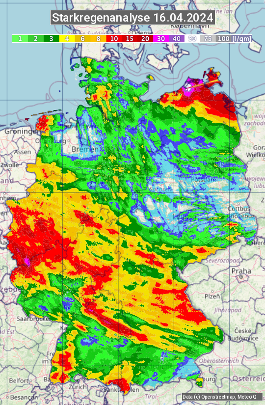 Die Starkregenanalyse zeigt die 24h-Niederschlagssumme am 16.04.2024. Sie basiert auf Radardaten vom Deutschen Wetterdienst in Kombination mit Wetterstationsbeobachtungen.