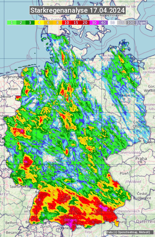 Die Starkregenanalyse zeigt die 24h-Niederschlagssumme am 17.04.2024. Sie basiert auf Radardaten vom Deutschen Wetterdienst in Kombination mit Wetterstationsbeobachtungen.