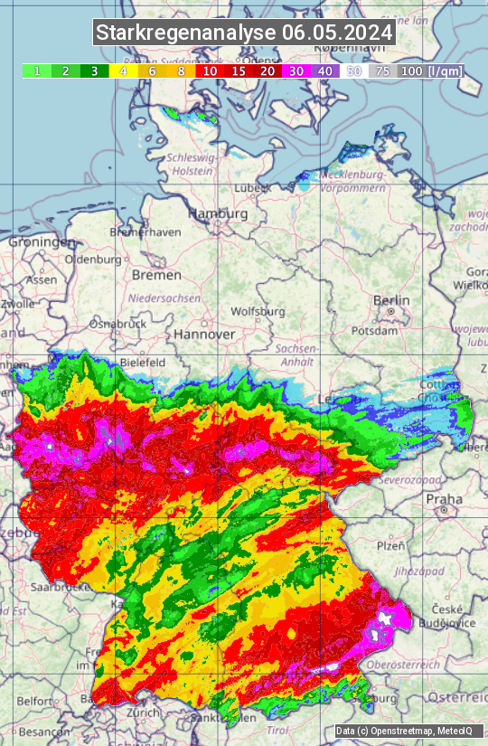 Die Starkregenanalyse zeigt die 24h-Niederschlagssumme am 06.05.2024. Sie basiert auf Radardaten vom Deutschen Wetterdienst in Kombination mit Wetterstationsbeobachtungen.