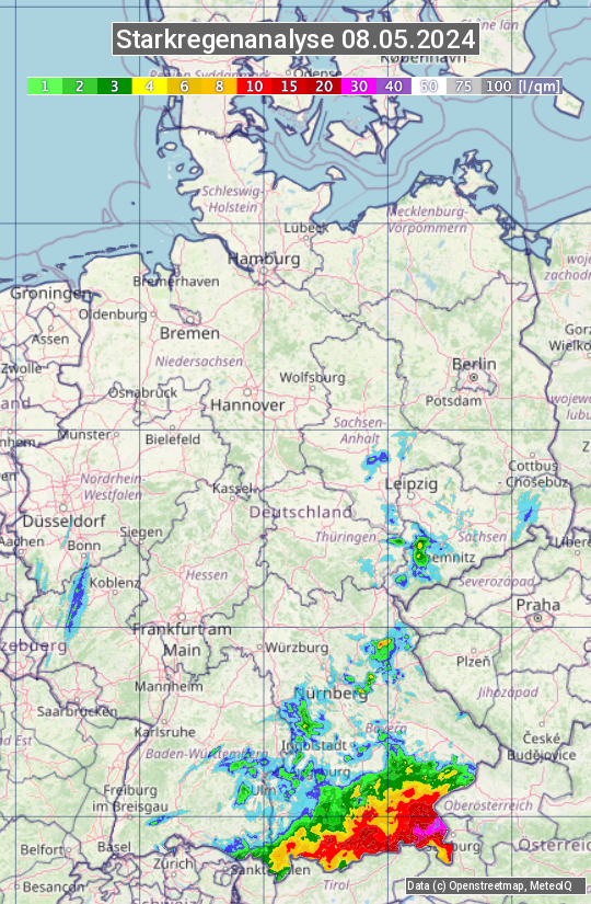 Die Starkregenanalyse zeigt die 24h-Niederschlagssumme am 08.05.2024. Sie basiert auf Radardaten vom Deutschen Wetterdienst in Kombination mit Wetterstationsbeobachtungen.