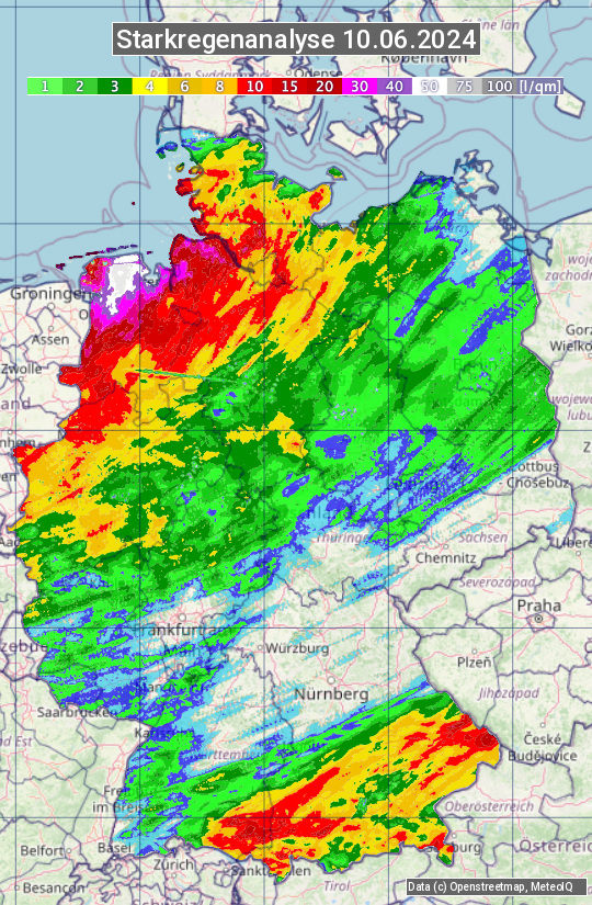 Die Starkregenanalyse zeigt die 24h-Niederschlagssumme am 10.06.2024. Sie basiert auf Radardaten vom Deutschen Wetterdienst in Kombination mit Wetterstationsbeobachtungen.