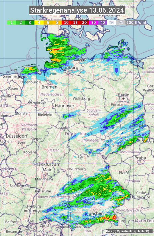 Die Starkregenanalyse zeigt die 24h-Niederschlagssumme am 13.06.2024. Sie basiert auf Radardaten vom Deutschen Wetterdienst in Kombination mit Wetterstationsbeobachtungen.
