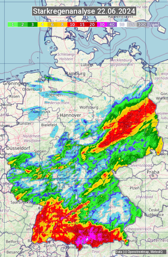 Die Starkregenanalyse zeigt die 24h-Niederschlagssumme am 22.06.2024. Sie basiert auf Radardaten vom Deutschen Wetterdienst in Kombination mit Wetterstationsbeobachtungen.