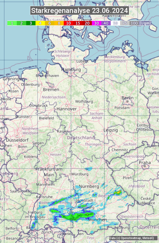 Die Starkregenanalyse zeigt die 24h-Niederschlagssumme am 23.06.2024. Sie basiert auf Radardaten vom Deutschen Wetterdienst in Kombination mit Wetterstationsbeobachtungen.