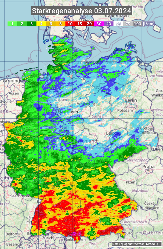 Die Starkregenanalyse zeigt die 24h-Niederschlagssumme am 03.07.2024. Sie basiert auf Radardaten vom Deutschen Wetterdienst in Kombination mit Wetterstationsbeobachtungen.