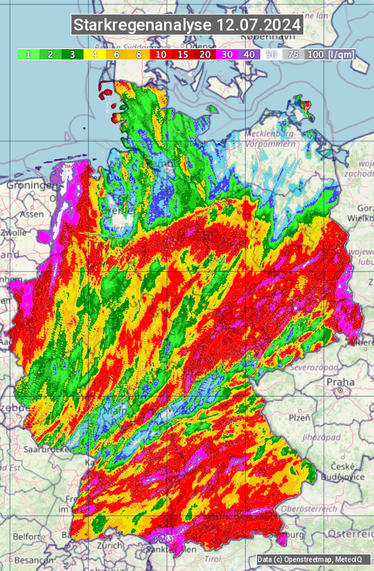Die Starkregenanalyse zeigt die 24h-Niederschlagssumme am 12.07.2024. Sie basiert auf Radardaten vom Deutschen Wetterdienst in Kombination mit Wetterstationsbeobachtungen.