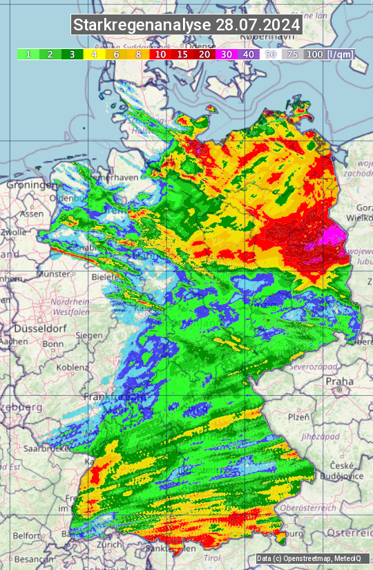 Die Starkregenanalyse zeigt die 24h-Niederschlagssumme am 28.07.2024. Sie basiert auf Radardaten vom Deutschen Wetterdienst in Kombination mit Wetterstationsbeobachtungen.